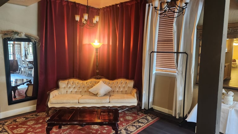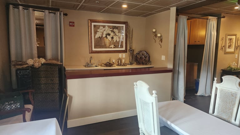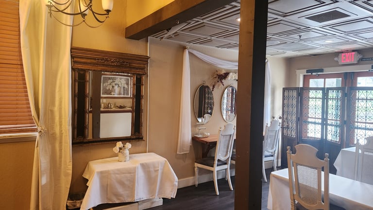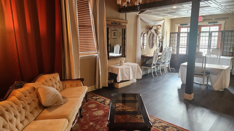 The Lounge is composed of two adjoining rooms that create a flexible setting for more intimate gatherings. The front room accommodates seated dining for up to 50 guests, while the adjoining rear space — complete with a wet bar — provides a more relaxed environment suited for conversation, small performances, or cocktail-style events.